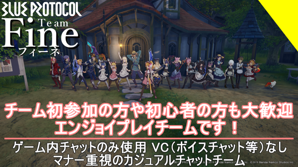 チーム『Fine』ブルプロ内のチャットで交流や雑談を楽しむチームです。チームメンバー同士でSS撮影やミッション、ラッシュバトルなど参戦しています。ノルマなど制限は一切ありませんので、自分のペースで楽しむ方にぴったりなチームです